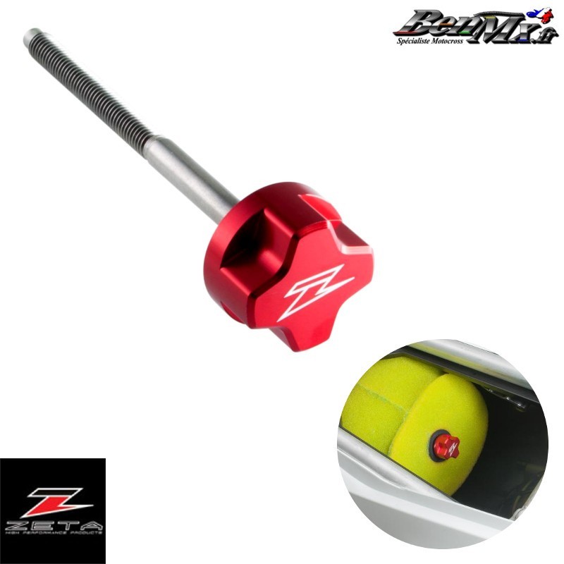 Vis de filre à air ZETA - 125-250 CR 1997/2007 - 125-250 KX 2000/2008 Vis de filtre à air en aluminium CNC. La tête arrondie plus grande, avec des rainures pour les doigts, facilite la rotation de la vis du filtre. Finition anodisée rouge avec logo imprimé au laser sur la tête de vis du filtre. La partie filetée de la vis est en acier inoxydable durable.