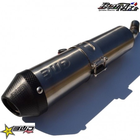 Silencieux Bud Racing inox KTM 250 SX 2019/2022 - 250/300 EXC 2020/2023 - HUSQVARNA 250 TC 2019/2022 - 250/300 TE 2020/2023 - GASGAS 250/300 MC/EC 2021/2023 Les parties en métal sont 100% inox anti corrosion Nos nouveaux modeles sont sans rivets pour une plus grande longévité et un remplacement facilité de la laine de roche Livrés avec collier inox complet