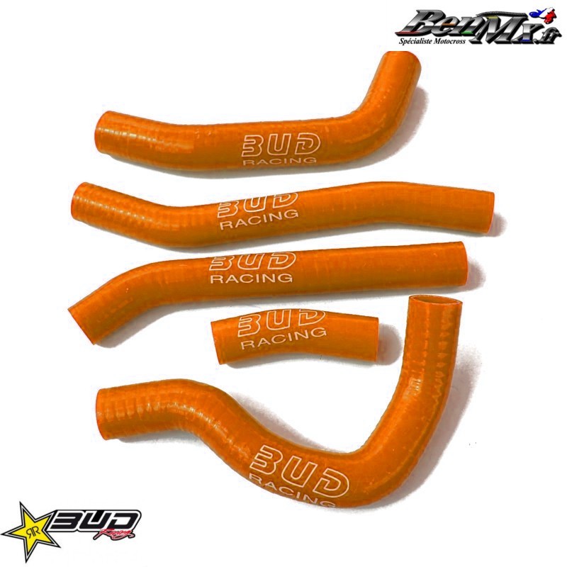 Durites de refroidissement Bud Racing Orange KTM 250 SX-F 2019/2022 - 250 EXC-F 2020/2023 Kit durites de radiateurs BUD Racing Les durites sont en silicone renforcé par du polyester, elles résistent aux très hautes températures (+200°c) et améliore le refroidissement Meilleur vieillissement et résistance à l'usure tout en améliorant le look de votre moto