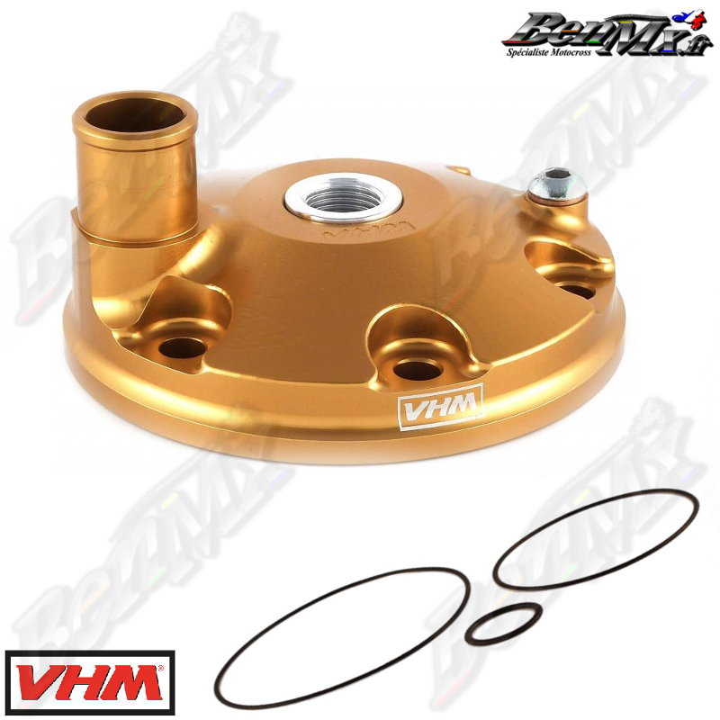 VHM - Culasse Or sans dôme (avec joints de culasse) - GASGAS 125 MC 2021/2023 - KTM 125 SX 2016/2022 - HUSQVARNA 125 TC 2016/2022 Les culasses VHM de rechange dorées avec chambres de combustion interchangeables sont bien connues dans le monde de la course 2 temps. Elles sont spécialement développées pour une puissance optimale pendant toute la course. La culasse comporte un conduit d'eau spécialement conçu pour un débit d'eau optimal. - Plus de puissance moteur - Meilleur transfert de chaleur - Chambres de combustion interchangeables