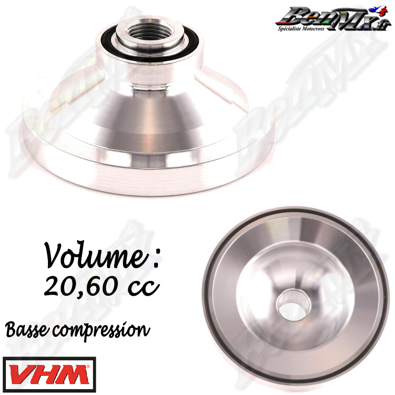 VHM - Dôme basse compression - Volume 20,60cc - HONDA 250 CR 2005/2007 La chambre de combustion peut être réglée rapidement en fonction de la piste et des conditions météorologiques, car les dômes sont faciles à changer. Les dômes sont en aluminium aéronautique pour une résistance à la détonation. Il existe différents dômes avec différents volumes disponibles pour chaque culasse.