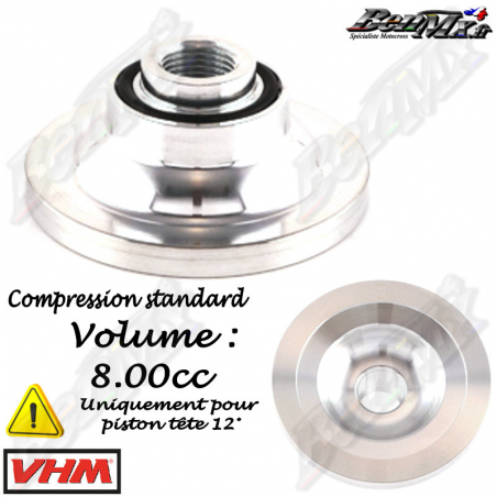 VHM - Dôme standard 12° (Uniquement pour piston tête 12°) - Volume 8,00cc - KTM 85 SX 2004/2012 Les culasses VHM de rechange dorées avec chambres de combustion interchangeables sont bien connues dans le monde de la course 2 temps. Elles sont spécialement développées pour une puissance optimale pendant toute la course. La culasse comporte un conduit d'eau spécialement conçu pour un débit d'eau optimal. - Plus de puissance moteur - Meilleur transfert de chaleur - Chambres de combustion interchangeables