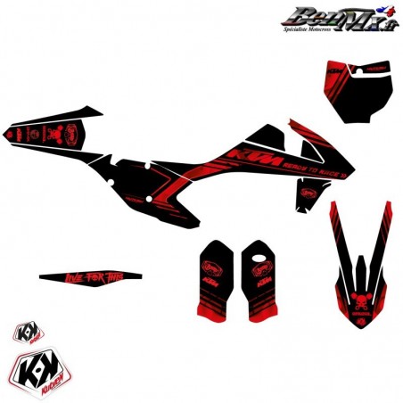Le kit déco comprend: - Garde boue arrière - Plaques latérales - Boite à air - Ouies de radiateur Plaque avant - Garde boue avant - Protections de fourche - Bras oscillant