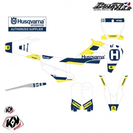 Le kit déco comprend: - Garde boue arrière - Plaques latérales - Boite à air - Ouies de radiateur Plaque avant - Garde boue avant - Protections de fourche - Bras oscillant