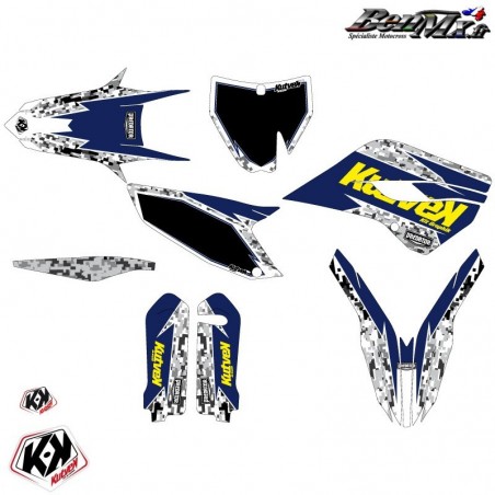 Le kit déco comprend: - Garde boue arrière - Plaques latérales - Boite à air - Ouies de radiateur Plaque avant - Garde boue avant - Protections de fourche - Bras oscillant