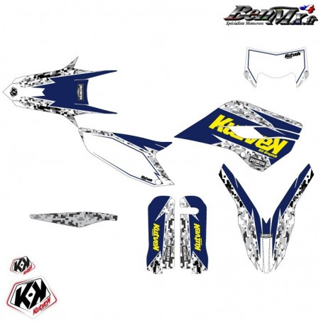 Le kit déco comprend: - Garde boue arrière - Plaques latérales - Boite à air - Ouies de radiateur Plaque avant - Garde boue avant - Protections de fourche - Bras oscillant