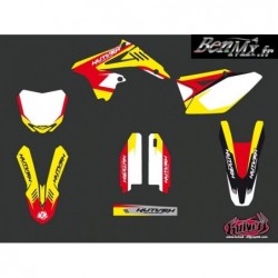 Le kit déco comprend: - Garde boue arrière - Plaques latérales - Boite à air - Ouies de radiateur Plaque avant - Garde boue avant - Protections de fourche - Bras oscillant