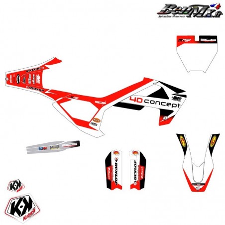 Le kit déco comprend: - Garde boue arrière - Plaques latérales - Boite à air - Ouies de radiateur Plaque avant - Garde boue avant - Protections de fourche - Bras oscillant