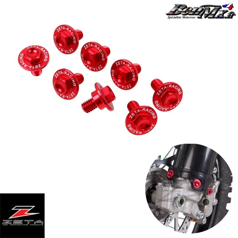 Vis de protèges fourche ZETA Rouge - Kit de vis en aluminium pour protège fourche Fabriqué en aluminium A7009 T-6, environ 50% plus léger que les vis de fixation d'origine. Finition anodisée de couleur pour la résistance à la corrosion, logo imprimé au laser sur la zone de la bride.