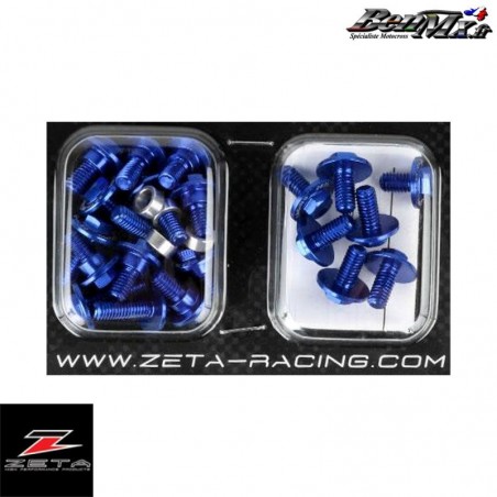 Boîte de vis pour fixation plastiques ZETA Bleu - KAWASAKI 250 KXF 2017/2020 Kit de vis en aluminium pour kit plastiques Fabriqué en aluminium A7009 T-6, environ 50% plus léger que les vis de fixation d'origine. Finition anodisée de couleur pour la résistance à la corrosion, logo imprimé au laser sur la zone de la bride.