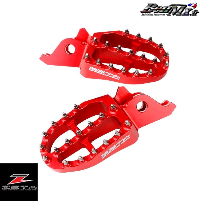Reposes pieds alu ZETA Rouge - Repose-pieds en aluminium forgé A2014 usiné CNC. Les repose-pieds de 57 mm de largeur offrent une meilleure traction et un meilleur contrôle des repose-pieds. La conception légère est livrée avec une belle finition anodisée et un logo imprimé laser ZETA. Les dents en acier inoxydable SUS 304 offrent une meilleure adhérence et sont remplaçable par des neuves lorsqu'elles auront perdues du grip