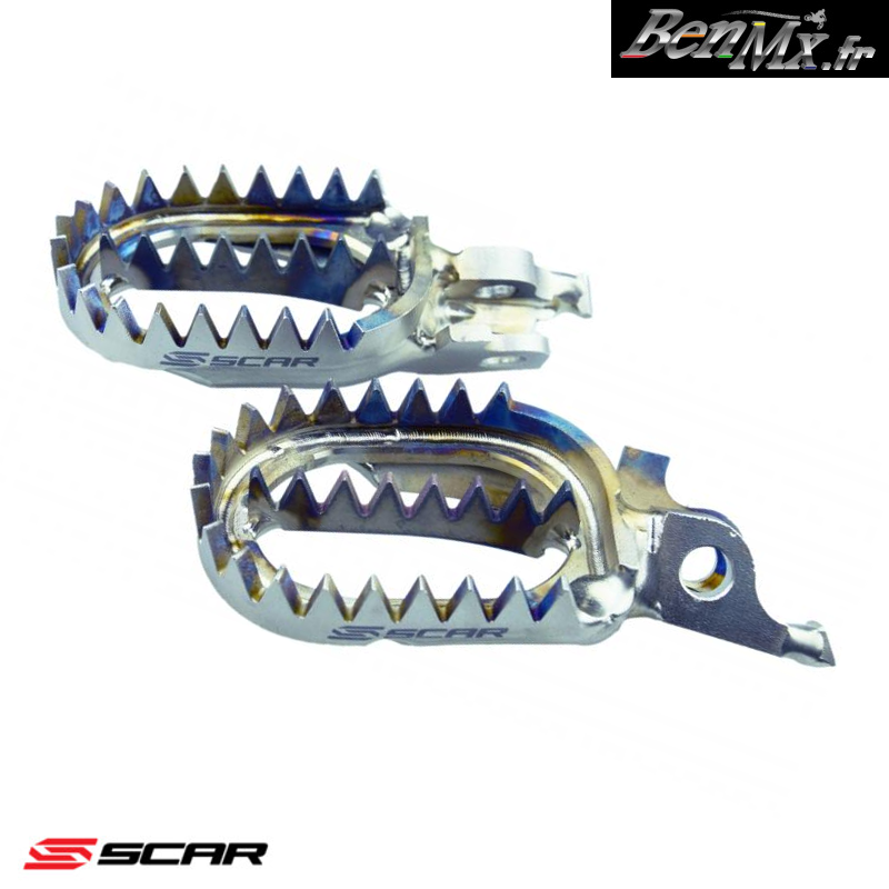 Repose pieds Titane SCAR Gripper KAWASAKI 250 KXF 2006/2023 - 450 KXF 2007/2023 Fabriqué en Titane type aéronautique Ti-6AL-4V Les repose-pieds font 60mm de large Soudés à la main Haute qualité et haute performance Ultra léger, environ 280g/paire 18 dents pour un grip accru et une meilleure stabilité Idéal dans les conditions extrêmes Utilisé par les Teams Factory