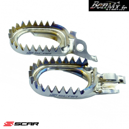 Repose pieds Titane SCAR Anti-boue KAWASAKI 250 KXF 2006/2023 - 450 KXF 2007/2023 Fabriqué en Titane type aéronautique Ti-6AL-4V Les repose-pieds font 60mm de large Soudés à la main Haute qualité et haute performance Ultra léger, environ 280g/paire 18 dents pour un grip accru et une meilleure stabilité Idéal dans les conditions extrêmes Utilisé par les Teams Factory