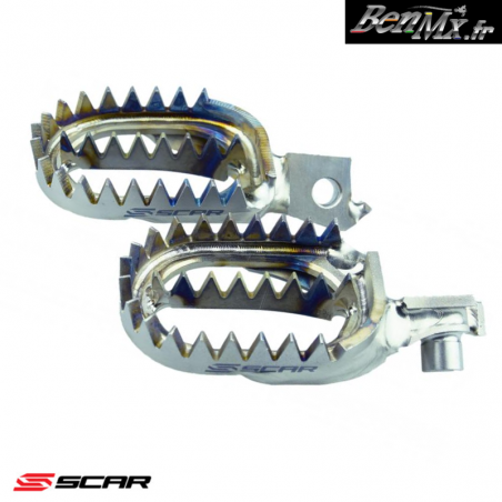 Repose pieds Titane SCAR Gripper SUZUKI 250 RMZ 2010/2023 - 450 RMZ 2012/2023 Fabriqué en Titane type aéronautique Ti-6AL-4V Les repose-pieds font 60mm de large Soudés à la main Haute qualité et haute performance Ultra léger, environ 280g/paire 18 dents pour un grip accru et une meilleure stabilité Idéal dans les conditions extrêmes Utilisé par les Teams Factory