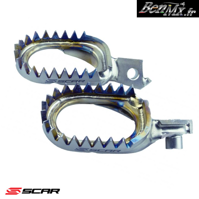 Repose pieds Titane SCAR Anti-boue SUZUKI 250 RMZ 2010/2023 - 450 RMZ 2012/2023 Fabriqué en Titane type aéronautique Ti-6AL-4V Les repose-pieds font 60mm de large Soudés à la main Haute qualité et haute performance Ultra léger, environ 280g/paire 18 dents pour un grip accru et une meilleure stabilité Idéal dans les conditions extrêmes Utilisé par les Teams Factory