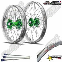 Roues complètes Bud Racing (avant+arrière) - Moyeux Vert - Jantes Argent - KAWASAKI 125-250 KX 2006/2008 - 250-450 KXF 2006/2025