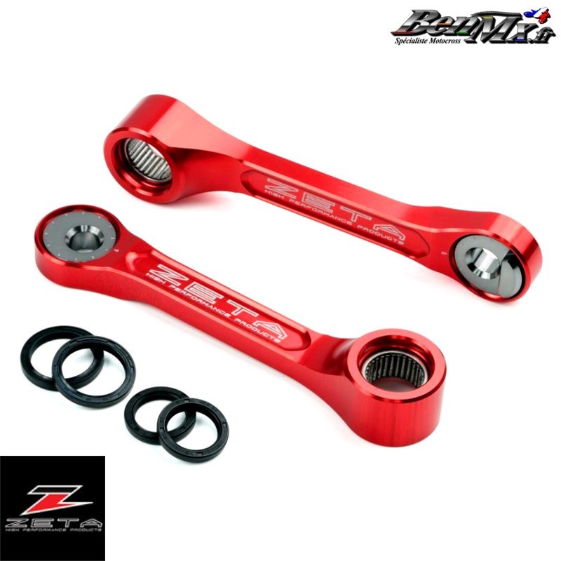 Biellettes d'amortisseur réglable ZETA Rouge - HONDA 250 CRF 2018/2021 - 450 CRF 2017/2020 Hauteur d'assise réglable en tournant l'accessoire pour changer la longueur de la biellette. Modifie la hauteur de votre motocross d'environ -25 mm à +5 mm Réglage de la plage de 7 clips au total. Livré avec roulements et joint anti-poussière Alliage d'aluminium de la série 7000, finition laser de haut niveau.