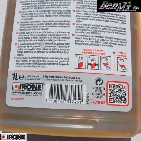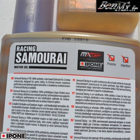 Samourai Racing est un lubrifiant 100% synthétique à base d'esters pour moteur 2 temps Déstiné à une conduites sportives Sa formulation et une lubrification optimale du moteur.