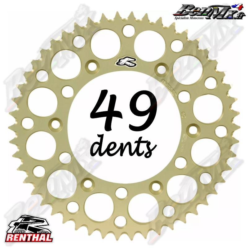 Couronne Alu RENTHAL - Anodisation Hard - 49 dents - YAMAHA 125-250 YZ 1999/2025 - YAMAHA 250-450 YZF 2001/2025 - ref:150U-520-49GBHA