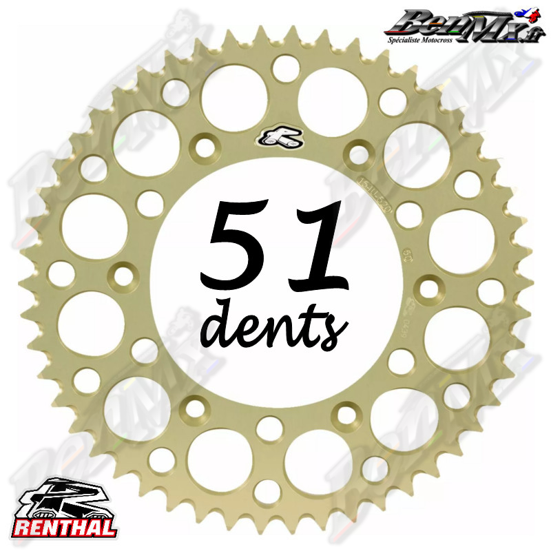 Couronne Alu RENTHAL - Anodisation Hard - 51 dents - YAMAHA 125-250 YZ 1999/2025 - YAMAHA 250-450 YZF 2001/2025 - ref:150U-520-51GBHA